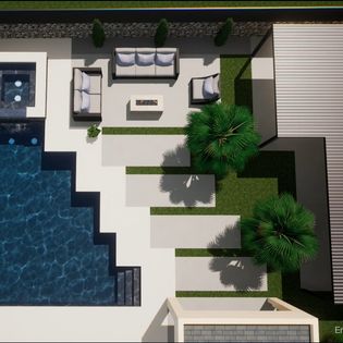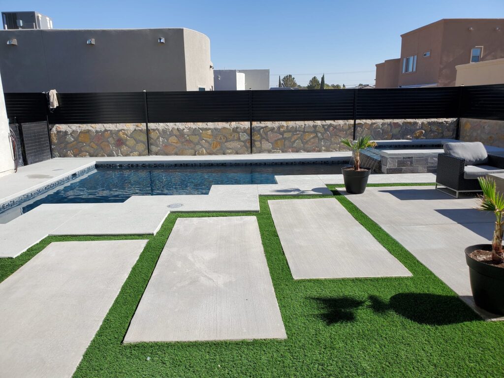 A modern geometric pool and outdoor living space designed to seamlessly integrate with the existing backyard layout. The Kathys Court Project emphasizes clean lines, layered elevations, and efficient design to deliver a refined, low-maintenance outdoor retreat in El Paso, TX.