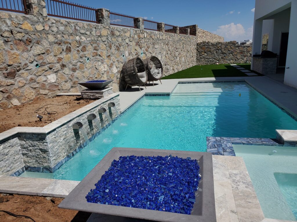 Elevated fire bowls filled with vibrant blue glass provide a bold contrast to the water elements, delivering warmth and a striking visual focal point.