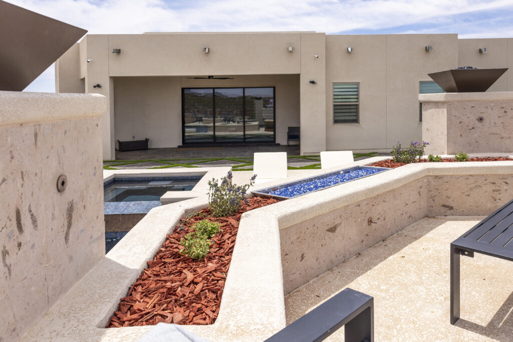 A raised terrace serves as the focal point of the backyard, combining linear fire features, fire bowls, and integrated water elements. Positioned above the pool, the terrace creates a strong architectural presence while enhancing both daytime views and nighttime ambiance.