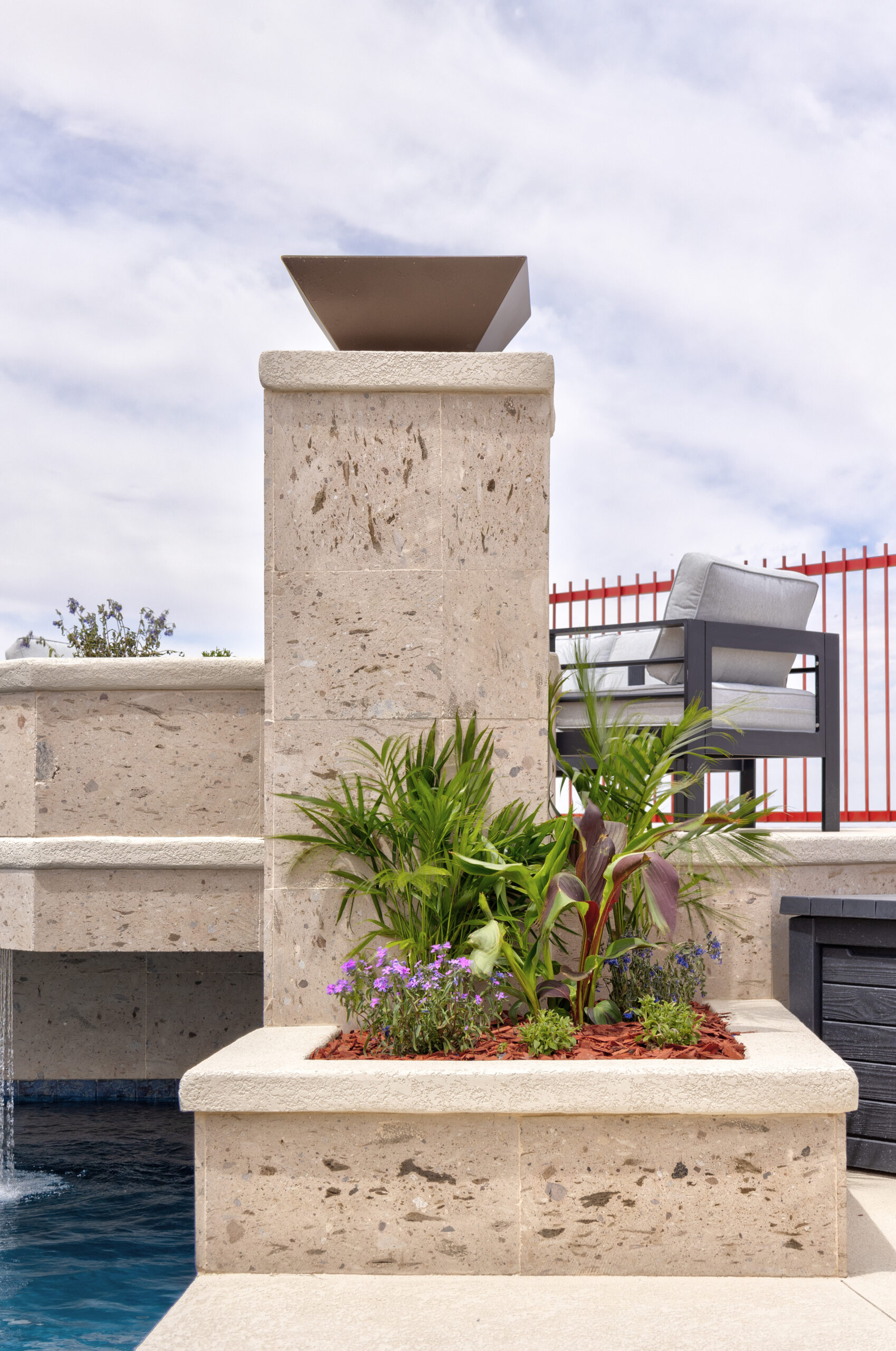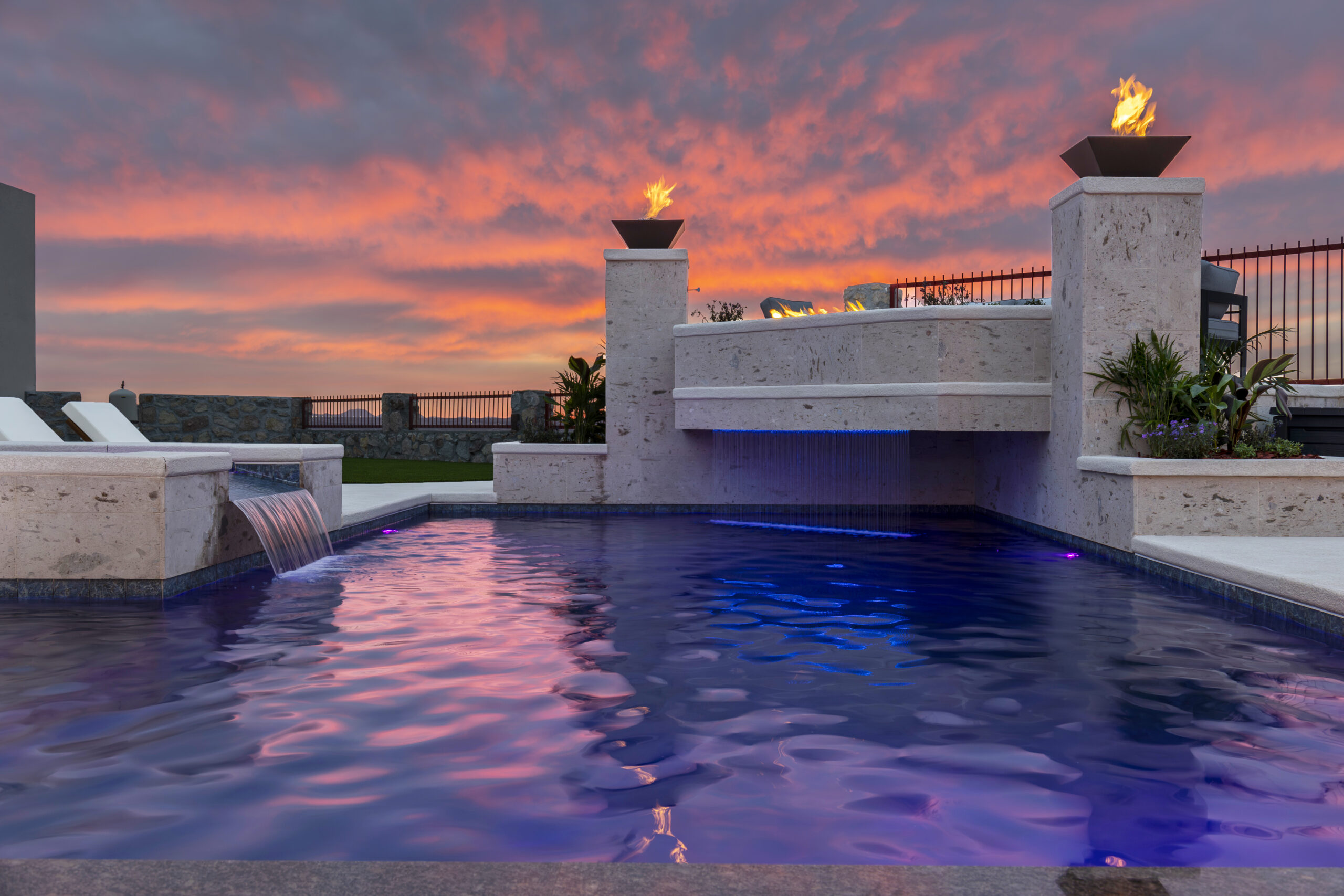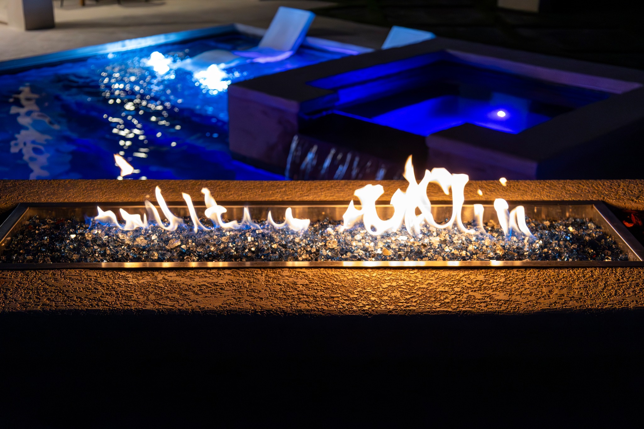 A raised terrace serves as the focal point of the backyard, combining linear fire features, fire bowls, and integrated water elements. Positioned above the pool, the terrace creates a strong architectural presence while enhancing both daytime views and nighttime ambiance.