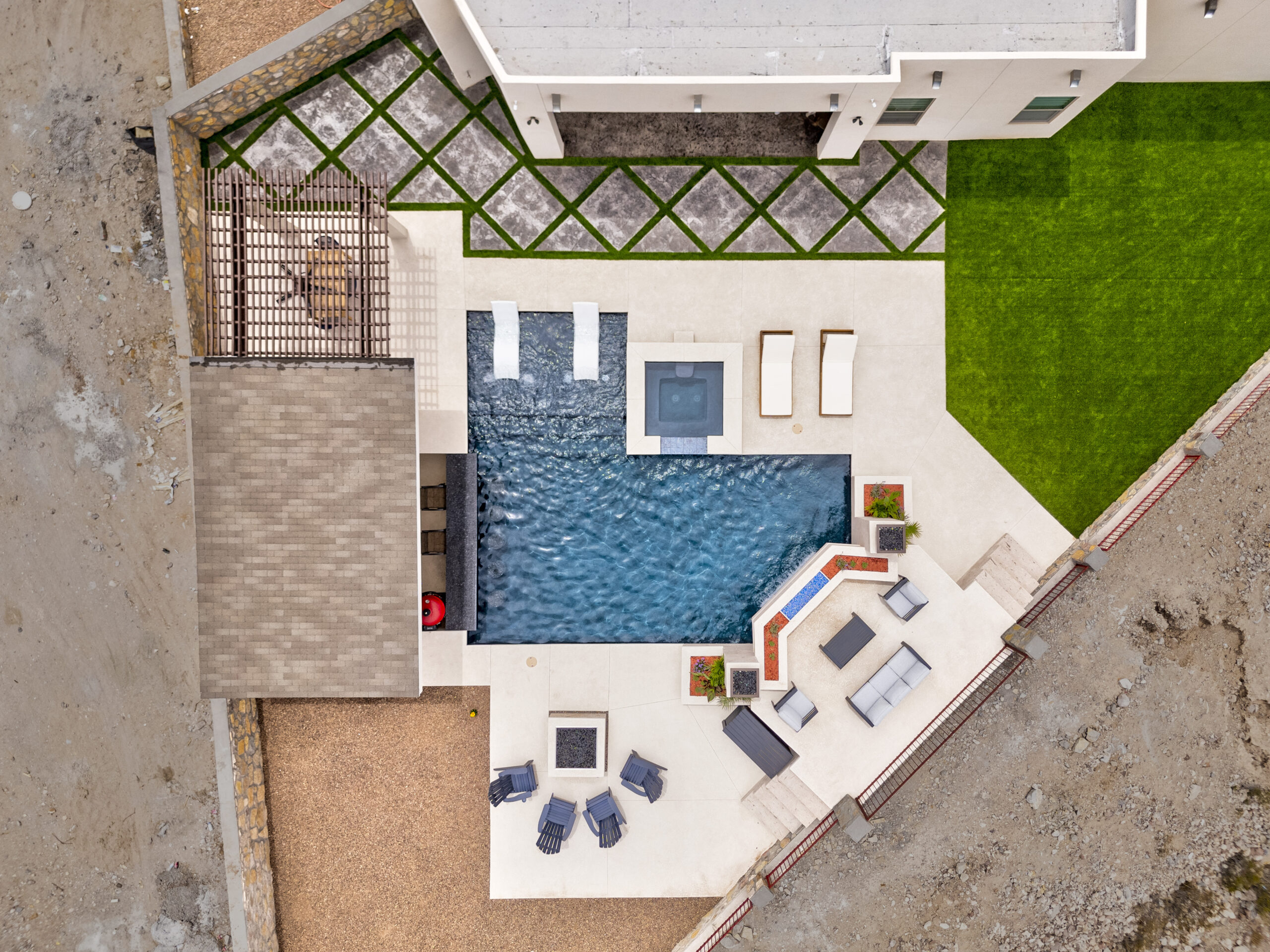 The Terrace View Project is a contemporary outdoor living space designed to maximize views, function, and architectural balance. Anchored by a geometric pool and layered elevations, the layout creates clearly defined areas for relaxation, entertaining, and visual impact—without disrupting the openness of the site.